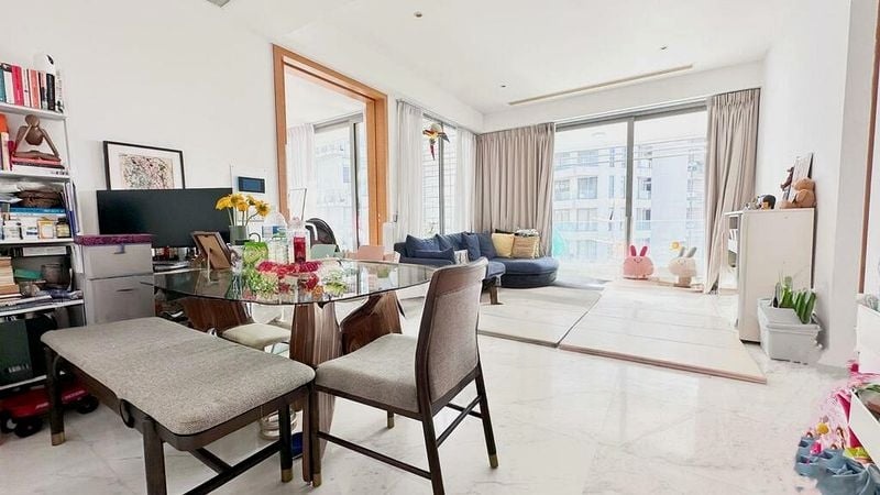 This well-maintained, fully-furnished unit features a private lift lobby for added exclusivity. The open-concept living room seamlessly connects to a balcony with a sleek glass railing, perfect for enjoying the tranquil surroundings. The modern kitchen is a chef's dream, equipped with integrated Miele appliances, a built-in wine chiller, and a stylish dark tile backsplash. Additional highlights include a separate laundry area and ample storage solutions throughout the unit.