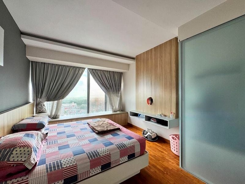 This well-maintained 3-bedroom, 2-bathroom unit features standout elements such as a rain shower in the luxurious bathroom, built-in platform beds in the common bedrooms, and a sleek modern kitchen equipped with a built-in oven. The thoughtful layout maximizes space, with wooden flooring adding warmth and elegance throughout.