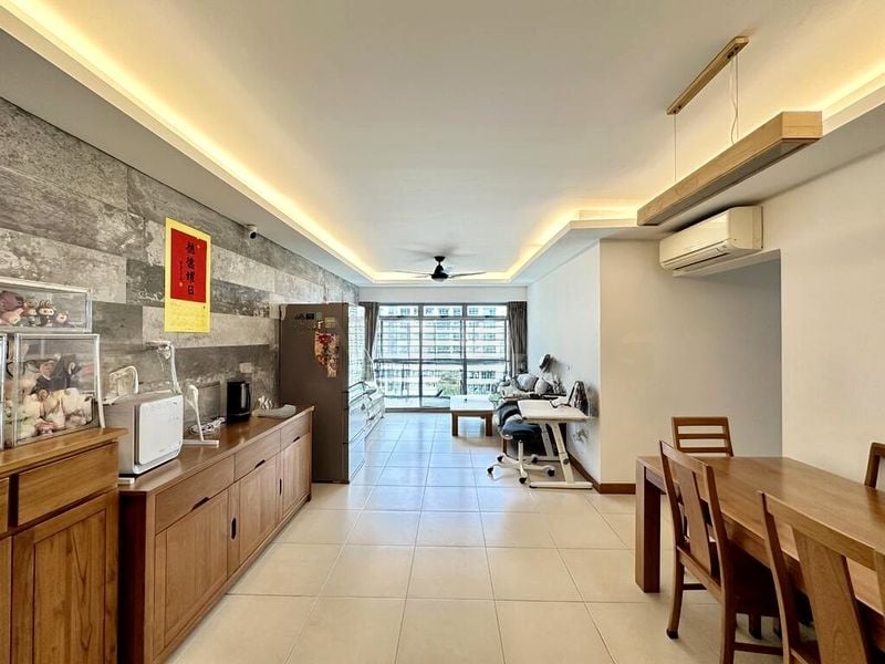 Step into a bright and airy sanctuary at 288A Punggol Pl, where abundant natural light floods the space, accentuating the elegant stone-textured feature wall and modern cove lighting. The large windows offer serene views of lush greenery and the surrounding residential landscape, creating a peaceful ambiance that invites relaxation.