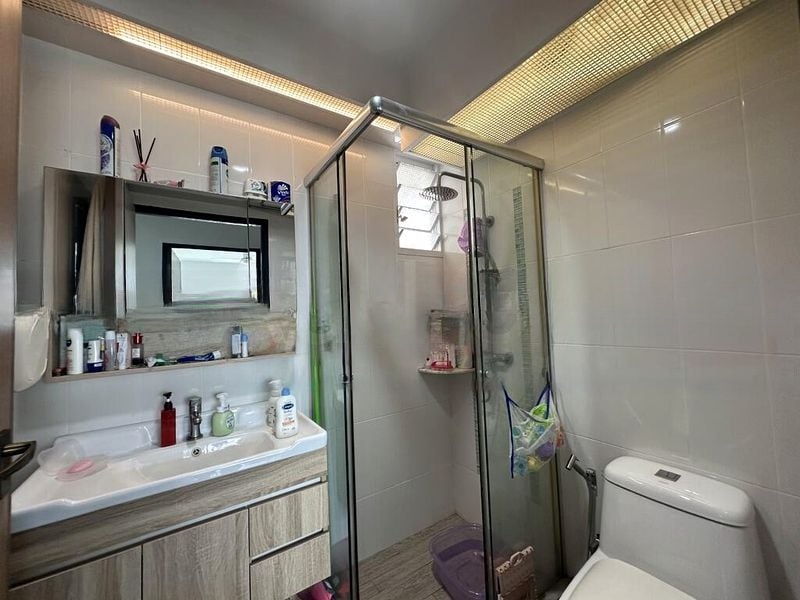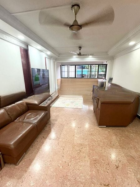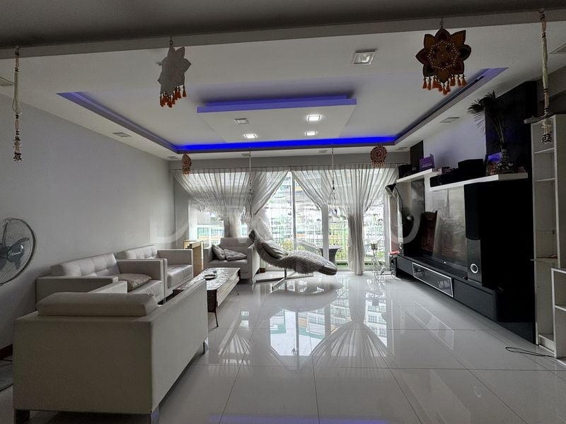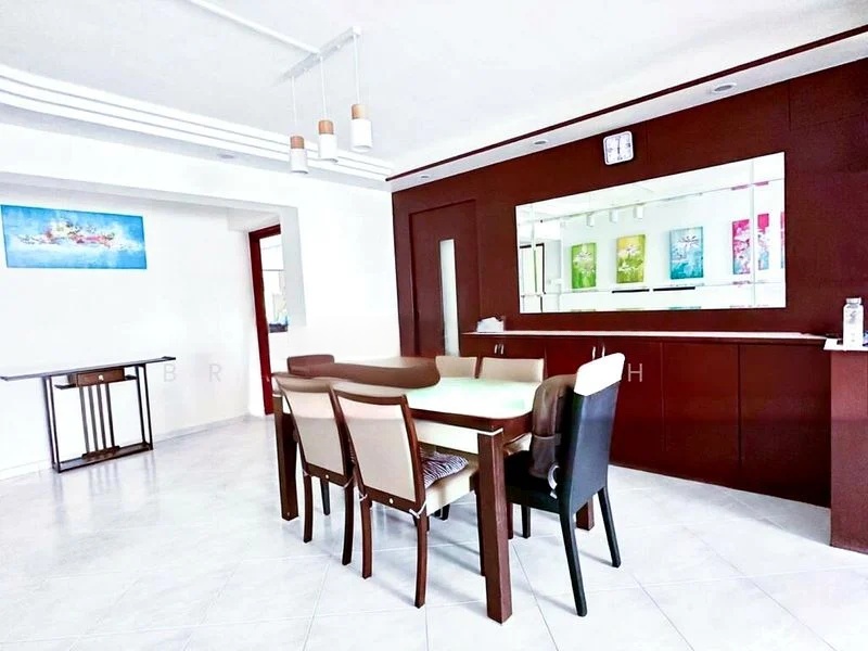 Step into this well-maintained HDB flat and feel the bright and airy ambiance that welcomes you. The large windows draped with sheer and heavy curtains allow natural light to dance across the modern white tiled flooring, while decorative wall art adds a touch of personality to the space. The built-in mirrored dining cabinet in the dining area creates an illusion of space, making it perfect for entertaining guests.