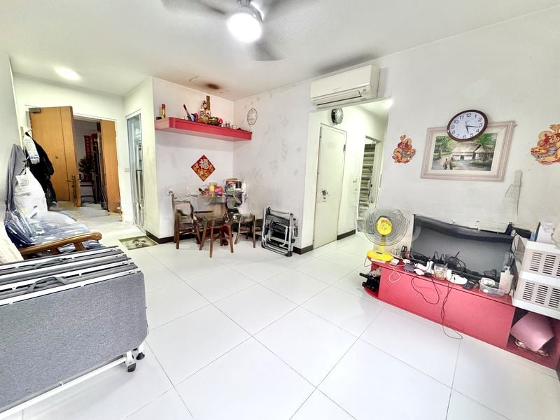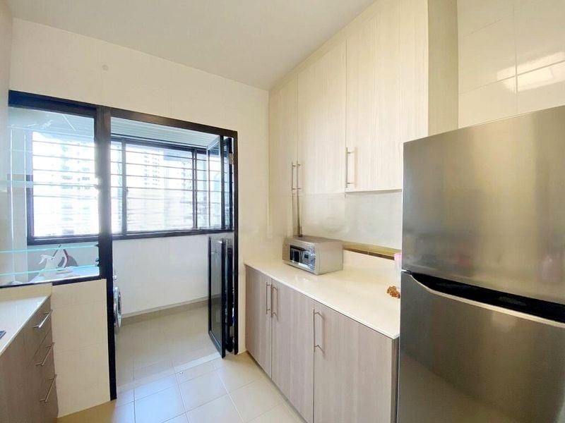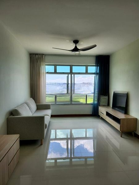 Step into a bright and functional living space where abundant natural light floods through black-framed windows, offering unblocked views of the surrounding greenery and urban HDB estate. The well-maintained interiors feature white tiled flooring and a cozy ambiance, making it an inviting retreat.
