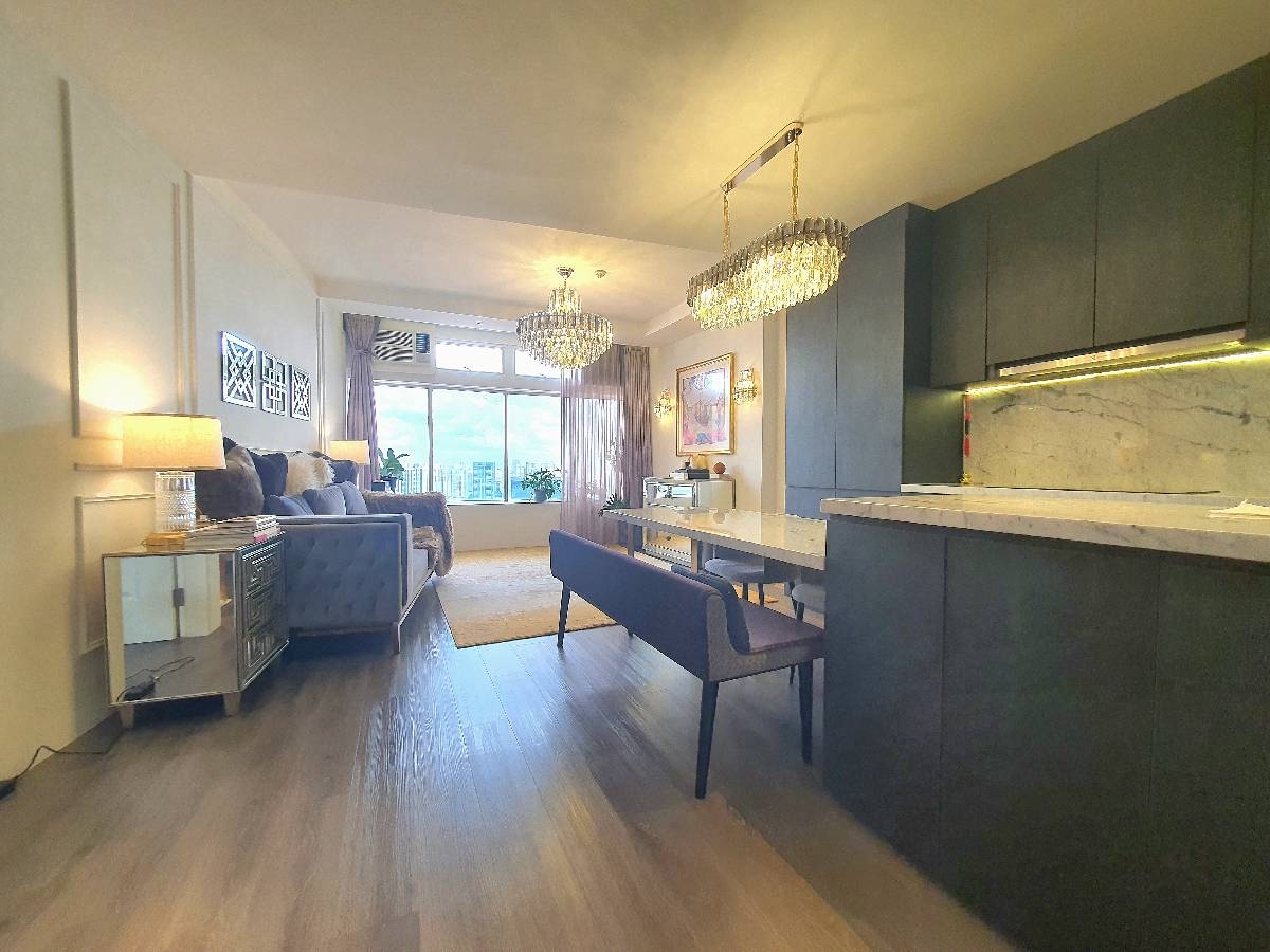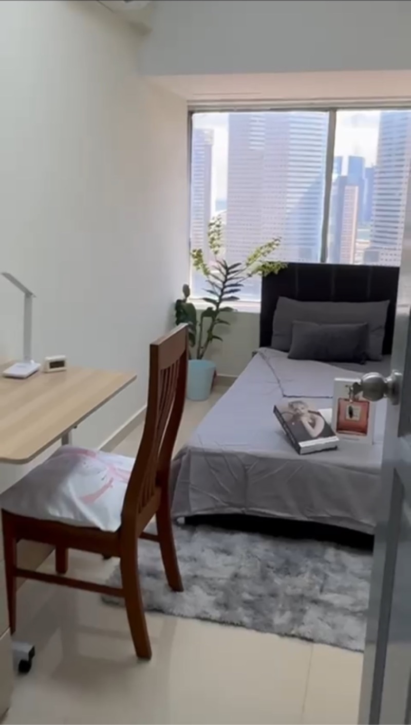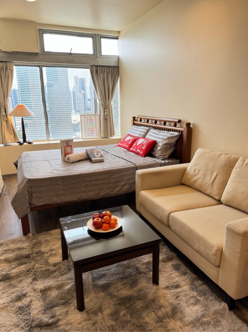 Step into a world of comfort and style with this beautifully maintained studio unit at The Plaza. The moment you enter, you are greeted by an abundance of natural light pouring through the floor-to-ceiling windows, showcasing stunning unobstructed views of the city skyline. The warm ambiance, complemented by a plush shag rug and a sleek wooden bed frame, creates an inviting atmosphere that feels like home.