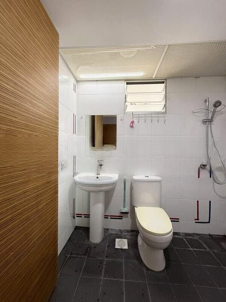 This well-maintained 1-bedroom flat features a highly efficient layout, including a separate galley kitchen with modern white cabinetry and black countertops, perfect for culinary enthusiasts. The bedroom boasts a stylish platform bed, a built-in vanity desk, and textured wall paneling, while the bathroom is equipped with a wall-mounted mirror cabinet and a window for ventilation, ensuring both functionality and style.