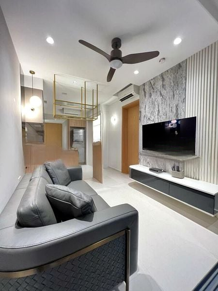 This well-maintained 1-bedroom plus study unit boasts an efficient layout that maximizes every inch. The open-concept kitchen is a chef's dream, featuring a marble-topped island, gold-toned hanging rack, and integrated appliances, while the dedicated study nook provides a perfect workspace. Custom built-in storage and integrated lighting niches in the hallway add a touch of luxury and practicality to daily living.