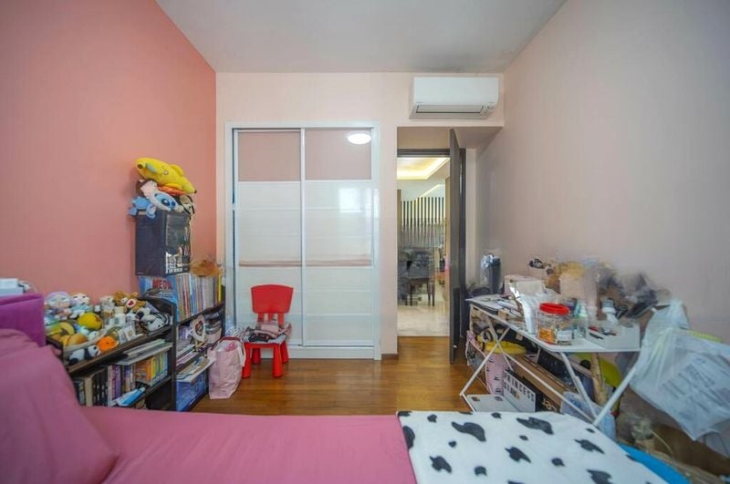 This well-maintained 3-bedroom unit boasts a thoughtful layout, featuring a raised wood platform in the master bedroom and built-in frosted glass wardrobes that enhance the contemporary feel. The bathrooms are elegantly appointed with marble-look tiles and modern fixtures, including a luxurious bathtub and a walk-in shower with a glass partition. The service balcony, equipped with a ceiling-mounted drying rack, adds practicality to the design.