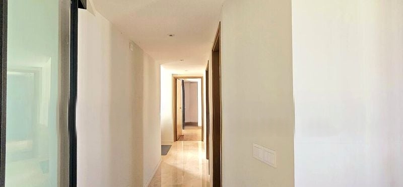 Step into a bright and airy sanctuary where abundant natural light dances across the marble-look flooring, accentuating the modern finishes throughout. The expansive living area, featuring a high ceiling and a custom floor-to-ceiling bookshelf, invites you to unwind while enjoying captivating views of the city skyline and lush greenery.