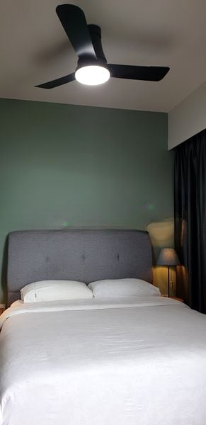 This well-maintained 1-bedroom flat boasts a thoughtful layout, with a cozy bedroom adorned with a green accent wall and built-in wardrobes that offer integrated storage solutions. The dining area, highlighted by a blue accent wall and a large wall mirror, is perfect for entertaining, while the modern bathroom features a glass shower enclosure and stylish tiling, ensuring a luxurious experience.