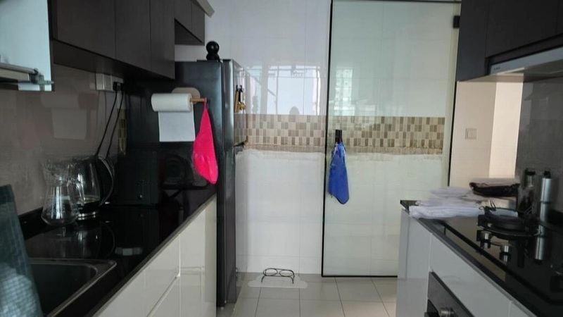 The well-designed layout features a seamless flow between the living, dining, and kitchen areas, perfect for entertaining. The kitchen boasts high-gloss red and white cabinetry, equipped with a built-in oven and microwave, complemented by sleek black solid surface countertops. Each bedroom is spacious, with the master featuring a wall-mounted TV and sliding door wardrobe, ensuring comfort and convenience for your family.