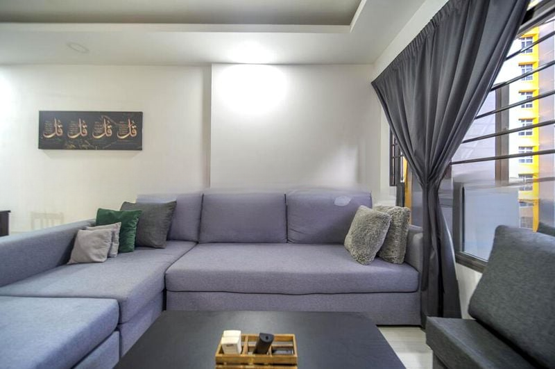 Step into a cozy sanctuary where a geometric accent wall in the living room draws you in, complemented by large windows that invite natural light and offer serene views of lush greenery. The ambiance is warm and welcoming, making it the perfect retreat after a long day.