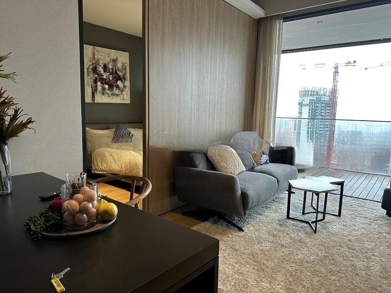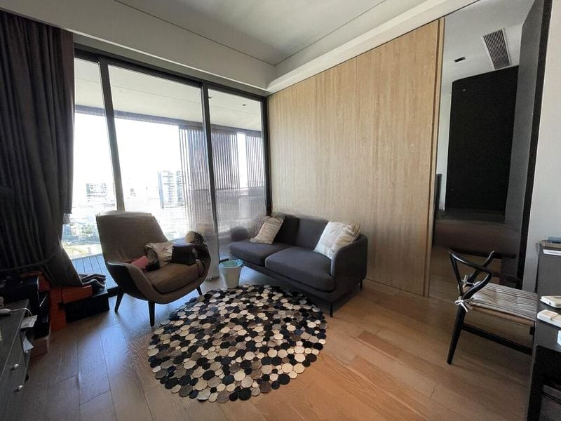 Step into this beautifully maintained studio unit and be greeted by an abundance of natural light streaming through the floor-to-ceiling sliding glass doors. The modern minimalist ambiance, complemented by wood-look flooring, creates a warm and inviting atmosphere. Enjoy unobstructed panoramic views of the city skyline from your spacious balcony, which features elegant wooden decking and an outdoor seating area perfect for relaxation.