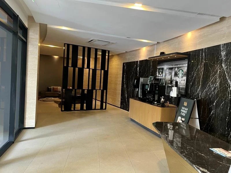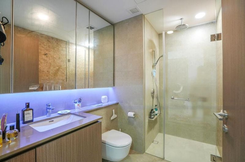 Step into a world of modern elegance as you enter this beautifully renovated 2-bedroom unit at Seaside Residences. Bathed in natural light, the open-concept kitchen and dining area feature a stunning grey stone-look island counter and a glass-enclosed kitchen that seamlessly blends style and functionality. The ambiance is enhanced by woven pendant lights and LED under-mirror vanity lighting, creating a sophisticated yet inviting atmosphere.
