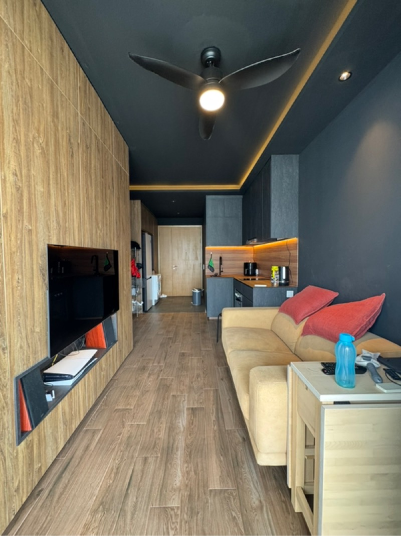 Step into a world of modern minimalism where abundant natural light floods the open-concept living space, highlighting the sleek dark accent walls and elegant wood-look flooring. The high-floor unit offers stunning urban views, creating a serene backdrop that invites relaxation and inspiration.
