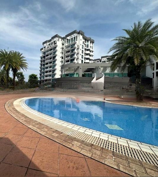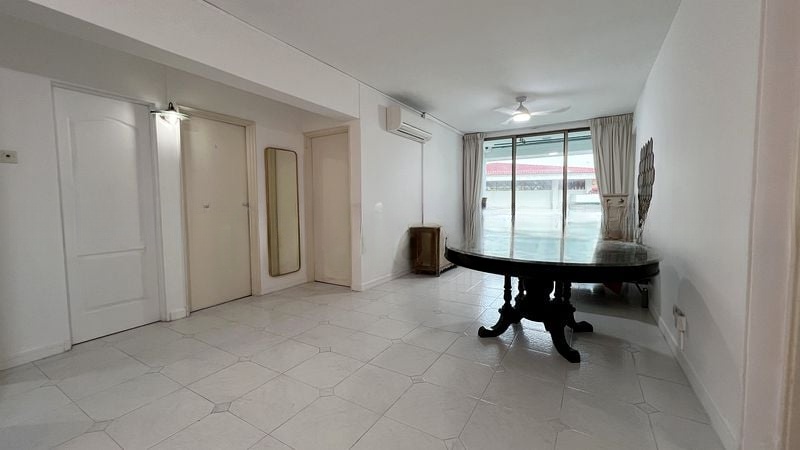 Step into a bright and airy sanctuary at Orchid Park Condominium, where abundant natural light floods the open-concept living and dining area. The spacious balcony, adorned with decorative railings, offers unobstructed views of lush greenery and palm trees, creating a serene backdrop for relaxation.