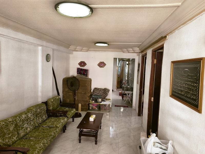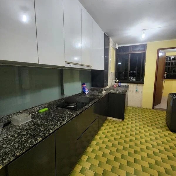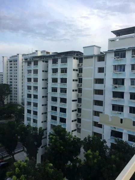 Step into a serene oasis at 21 Eunos Cres, where modern minimalist design meets comfort. The open-concept living area welcomes you with its marble-look porcelain tiles, seamlessly connecting to a cozy grey fabric sofa and a stylish TV console. Natural light filters through, creating a warm ambiance that invites relaxation, while views of lush greenery provide a refreshing backdrop.