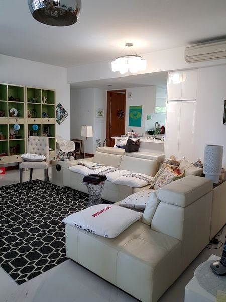 This well-maintained unit boasts a spacious layout, perfect for both relaxation and entertaining. The living room is adorned with a large sectional sofa and a geometric pattern rug, while the dining area is highlighted by modern pendant lighting above a six-seater dining set. Enjoy the luxury of a grand piano and built-in shelving that adds character and functionality to the space.