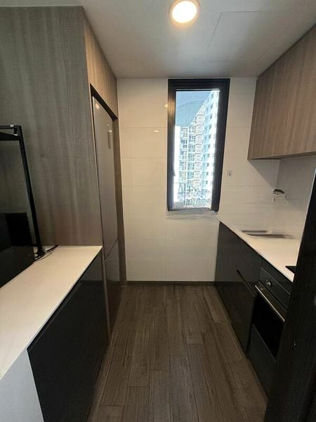 This well-maintained unit features a stylish kitchen equipped with wood-grain upper cabinets and matte black lower cabinets, complete with under-cabinet LED lighting, an integrated oven, and an induction hob. The bedroom boasts light wood flooring, a built-in window seat, and large windows that enhance the airy feel. The bathroom is a modern retreat, featuring a walk-in shower with a rain shower head and a backlit mirror cabinet, ensuring both functionality and style.