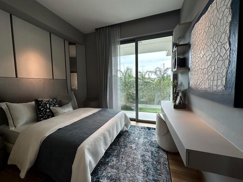 Step into a world of modern luxury as you enter this brand-new, designer-furnished unit. The abundant natural light floods through floor-to-ceiling windows, illuminating the exquisite marble flooring and highlighting the stunning views of lush greenery and palm trees. The ambiance is both sophisticated and inviting, perfect for relaxation and entertaining.