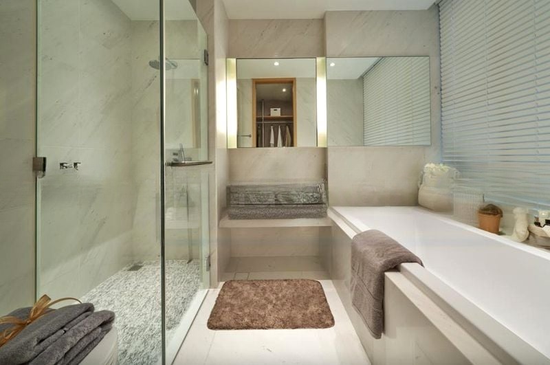 This spacious Type B2 apartment spans 1,625 sq ft and features an open-concept living and dining area seamlessly integrated with a chic island kitchen. The kitchen boasts white countertops, dark wood cabinetry, and a breakfast bar, ideal for casual dining. The master suite includes an en-suite bathroom with a glass shower enclosure and stone vanity, while the two common bedrooms feature custom built-in bunk beds and an integrated play area, catering to families.