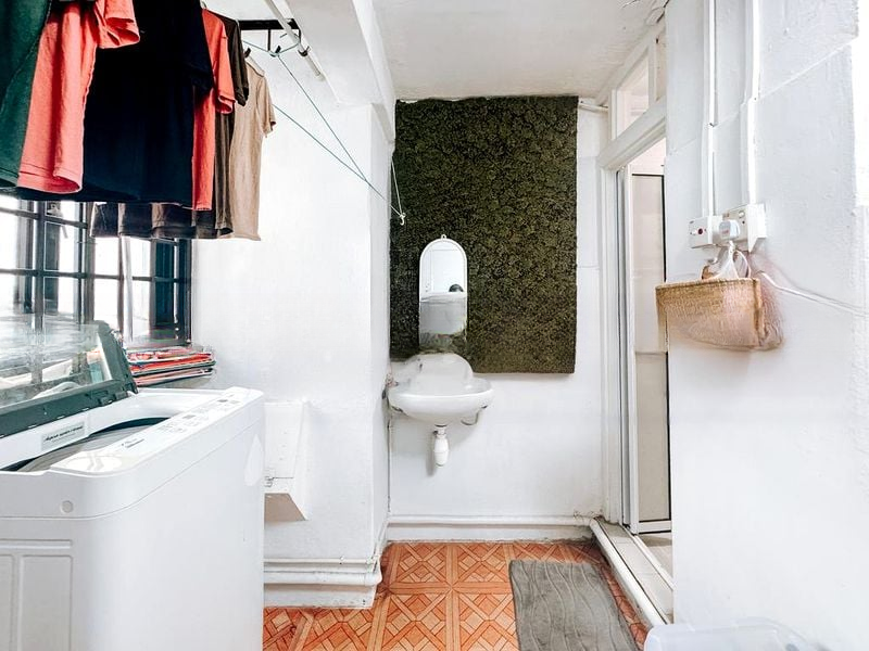 Step into this cozy 2-bedroom flat and feel the warmth of its functional layout, complemented by moderate natural light filtering through the windows. The retro-colored kitchen cabinetry and tiled flooring create a nostalgic ambiance, while overhead storage cabinets provide ample space for your essentials.