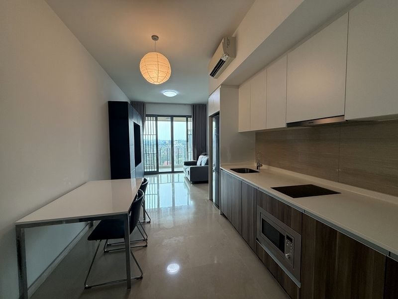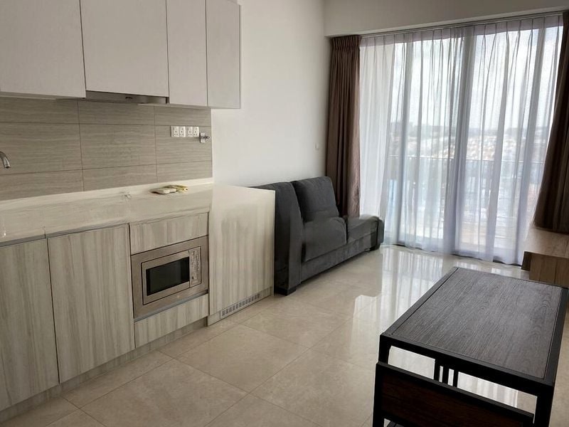 Step into a sanctuary of modern elegance at The Glades, where abundant natural light floods through floor-to-ceiling windows, illuminating the open-plan living and kitchen area. The minimalist design is complemented by large format floor tiles and a soothing neutral palette, creating a serene ambiance that invites relaxation and comfort.