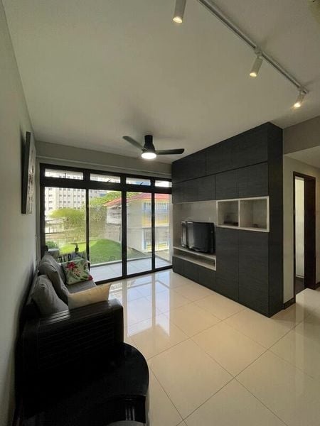 Step into a world of modern minimalism where abundant natural light floods through floor-to-ceiling windows, illuminating the sleek finishes and urban landscape views that greet you. The open living area, adorned with tiled flooring and a built-in TV console, seamlessly connects to a private balcony, creating a perfect space for relaxation and entertainment.