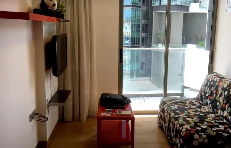 Step into a serene oasis at ESPADA, where abundant natural light floods through floor-to-ceiling windows, illuminating the modern minimalist design. The open-plan living room, featuring a sleek black leather sofa, seamlessly connects to a charming balcony with outdoor seating, creating a perfect space for relaxation and entertaining amidst urban greenery.