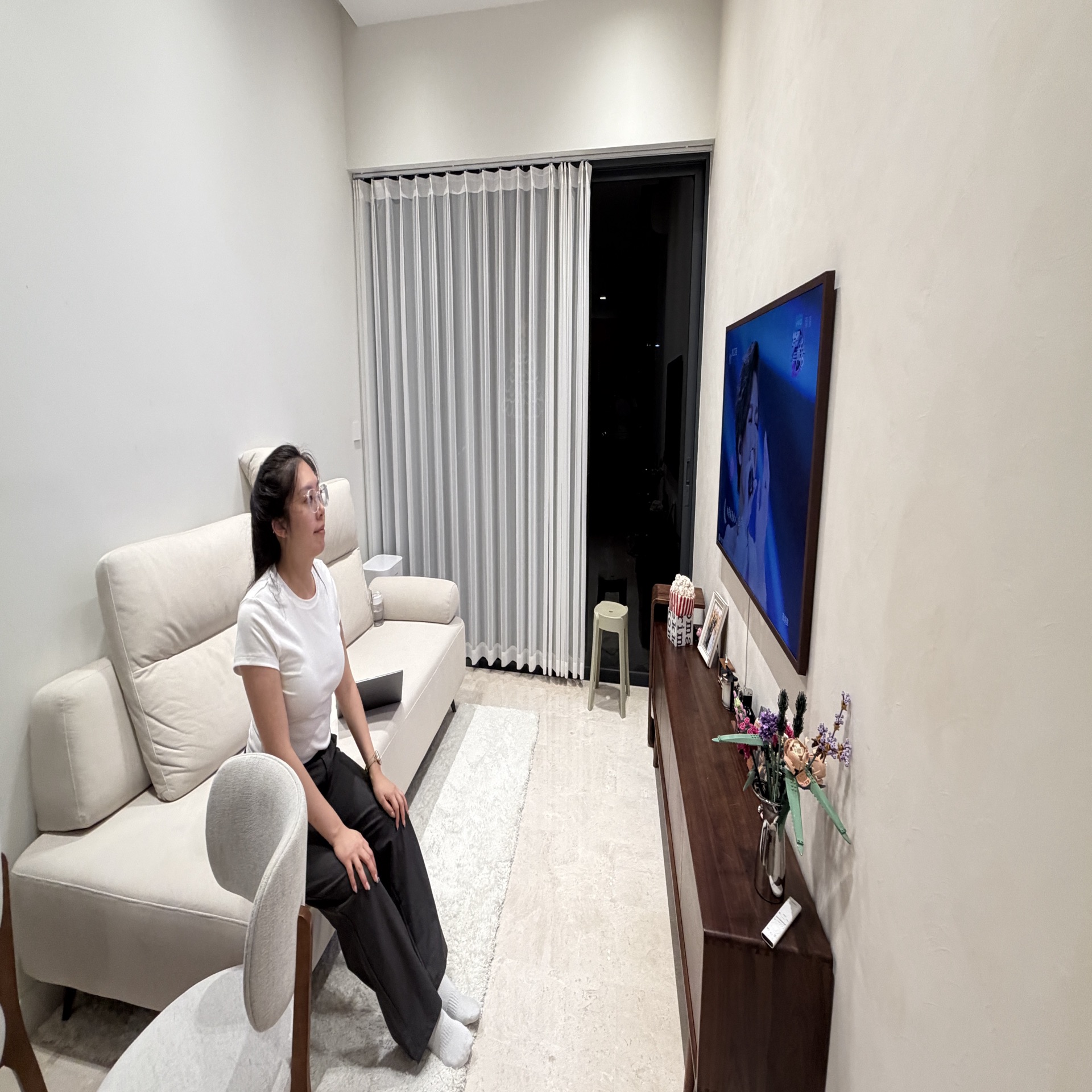 Step into a world of modern elegance as you enter this beautifully renovated unit at Alex Residences. The open concept layout invites natural light to dance across the marble-look floor tiles, accentuated by sheer floor-to-ceiling curtains that frame the stunning views. The ambiance is both inviting and sophisticated, with a neutral color palette that sets a tranquil tone throughout.
