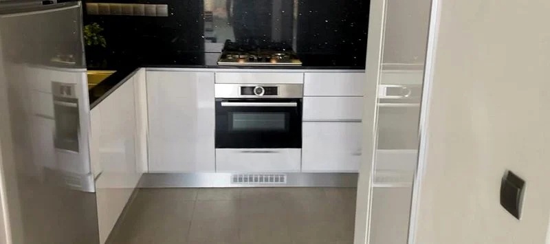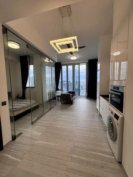 This efficient studio layout features a glass-partitioned bedroom that enhances the sense of space and light flow. The living area seamlessly connects to the balcony, perfect for relaxation or entertaining. The integrated kitchen boasts glossy white cabinetry and top-of-the-line appliances, while the bathroom showcases luxurious finishes, including a rain shower and vessel sink. Every detail has been thoughtfully curated to offer both style and functionality.