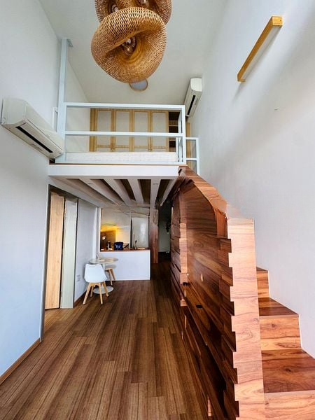 The unit features a stylish kitchen equipped with grey laminate cabinets, white countertops, and integrated appliances, perfect for culinary enthusiasts. The living area seamlessly connects to the balcony, providing direct access to outdoor relaxation. Modern pendant lighting illuminates the dining area, complemented by a chic black dining set with Eames-style chairs, ideal for entertaining.