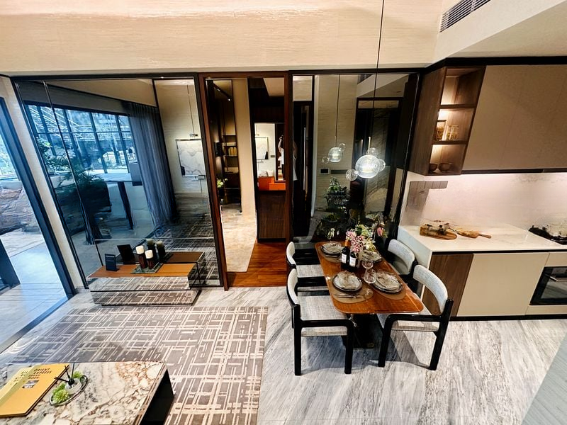 Step into a world of modern luxury as you enter this exquisite duplex loft at Grange 1866. The moment you walk in, you're greeted by the brilliance of mirrored ceilings and elegant marble flooring that reflect the abundant natural light, creating an inviting ambiance. The open-concept living area, adorned with designer furniture, seamlessly blends style and comfort, while the views of lush greenery provide a serene backdrop.