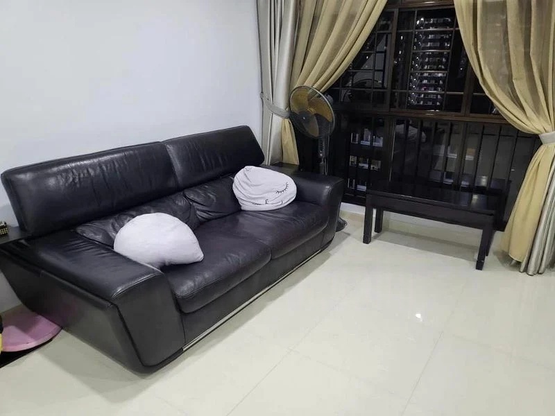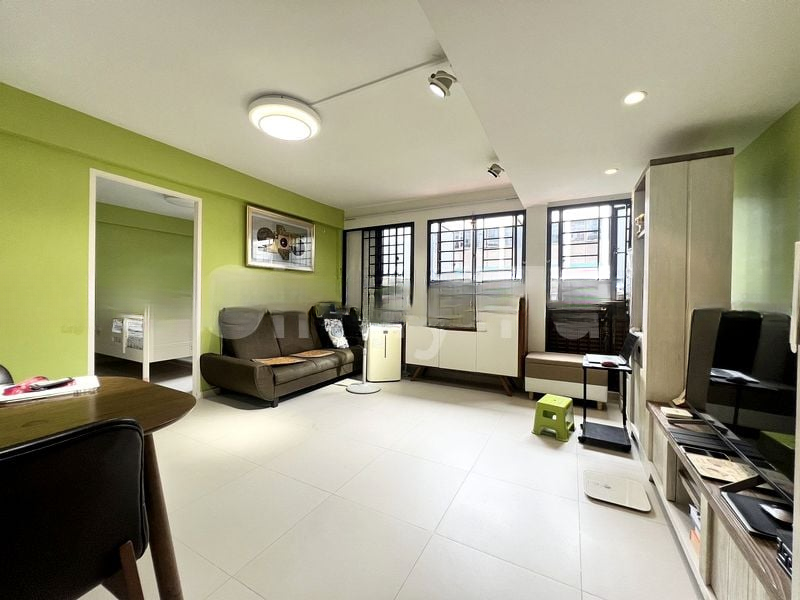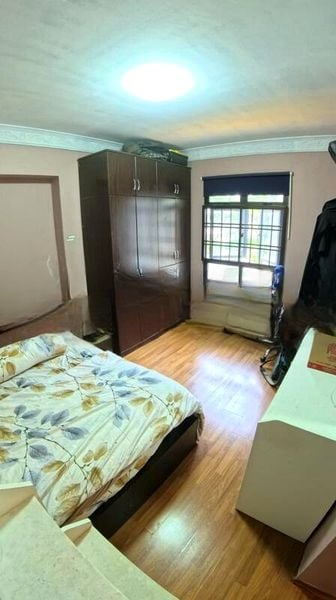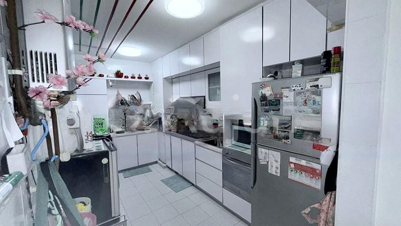 This well-maintained 3-bedroom flat features a vibrant galley kitchen with bold red cabinetry and grey countertops, perfect for culinary enthusiasts. The master bedroom boasts a full-height dark wood wardrobe and wooden flooring, while the common bedroom is equipped with a bunk bed and study area. A dedicated gym/music room offers versatility for your hobbies, making this unit a true gem.