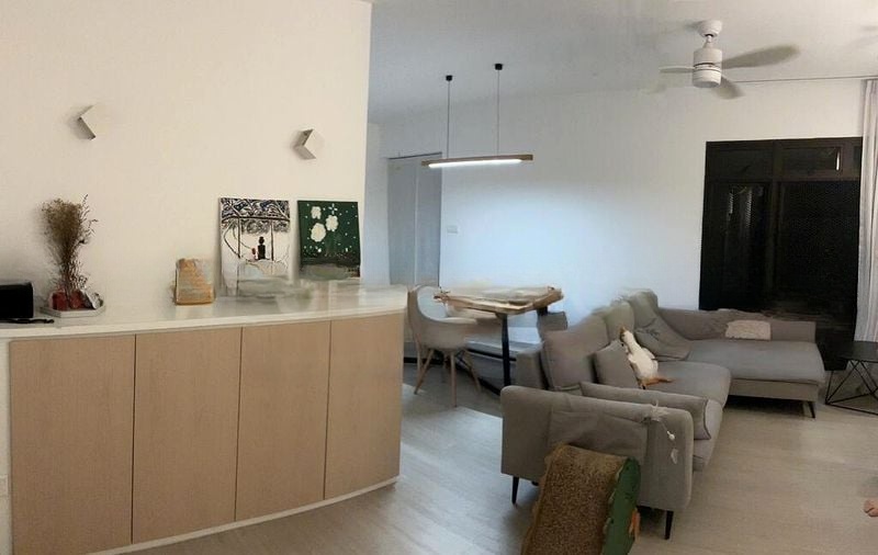 Step into this beautifully renovated 4-room flat and be greeted by a serene ambiance that exudes modern minimalism. The open-concept living area is bathed in natural light, offering a refreshing view of lush greenery through the window. The herringbone tile backsplash in the kitchen and the sleek black-framed glass shower screen in the bathroom add a touch of sophistication, while the floor-to-ceiling light wood wardrobes provide ample storage and a warm aesthetic.