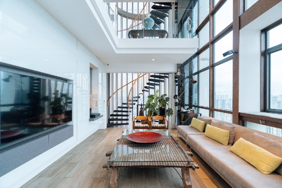 This meticulously designed unit boasts standout features including a spiral staircase, a mezzanine gallery perfect for showcasing art, and a glass-enclosed ensuite bathroom in the master bedroom. The living room features elegant wooden flooring and a built-in TV console, while the master bedroom showcases a geometric feature wall and an integrated open-concept wardrobe. The private roof terrace, complete with a pool and deck area, offers an exclusive retreat for leisure and gatherings.