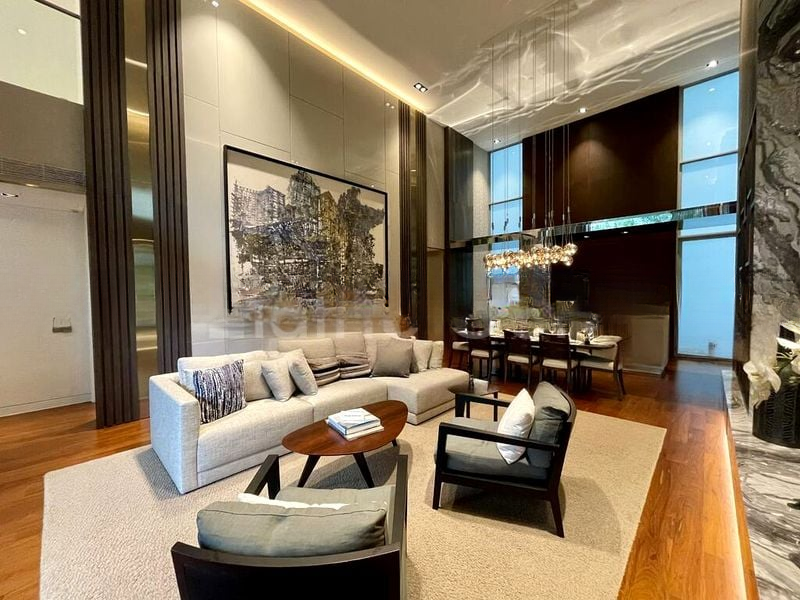 Step into a world of modern elegance as you enter this exquisite unit at The Oliv. The abundant natural light floods through the floor-to-ceiling windows, illuminating the double-volume high ceiling and highlighting the sleek dark wood flooring. The unique architectural facade and the lush greenery views create a serene ambiance, perfect for relaxation and entertaining.