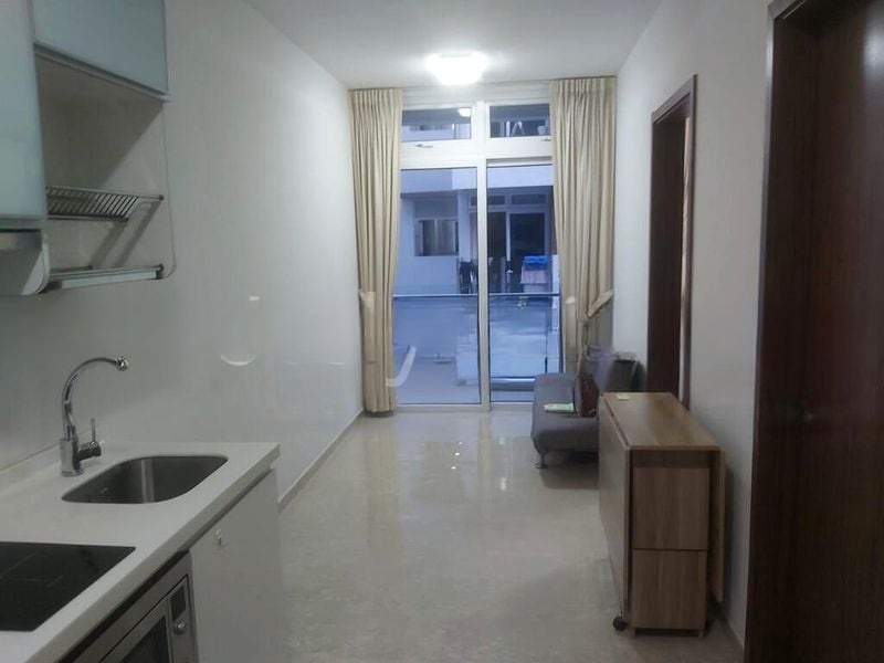 This well-maintained 1-bedroom unit boasts standout features such as a mirrored built-in wardrobe that enhances the sense of space, a rain shower for a touch of luxury, and a space-saving folding table perfect for dining or work. The kitchen is equipped with sleek white cabinetry, an induction hob, and a built-in microwave, catering to your culinary needs with style and efficiency.