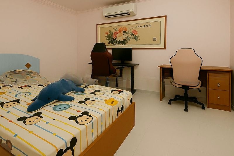 Step into a functional and lived-in space where decorative ceiling molding and large format floor tiles create an inviting atmosphere. The living room, with its recessed lighting and wooden TV console, offers a warm ambiance, while the dual study desks in the first bedroom and the metal bunk bed in the second bedroom cater perfectly to modern lifestyles.
