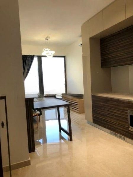 This well-maintained 1-bedroom unit boasts a thoughtfully designed layout, featuring a spacious living room complete with a stylish TV console and a cozy sofa. The dining area is highlighted by a chic square glass-top table surrounded by white upholstered chairs, while the kitchen is equipped with dark wood-grain cabinets, a built-in microwave, and an induction hob for the culinary enthusiast. The bathroom is a sanctuary of luxury, showcasing marble-patterned tiles and a glass-enclosed shower.
