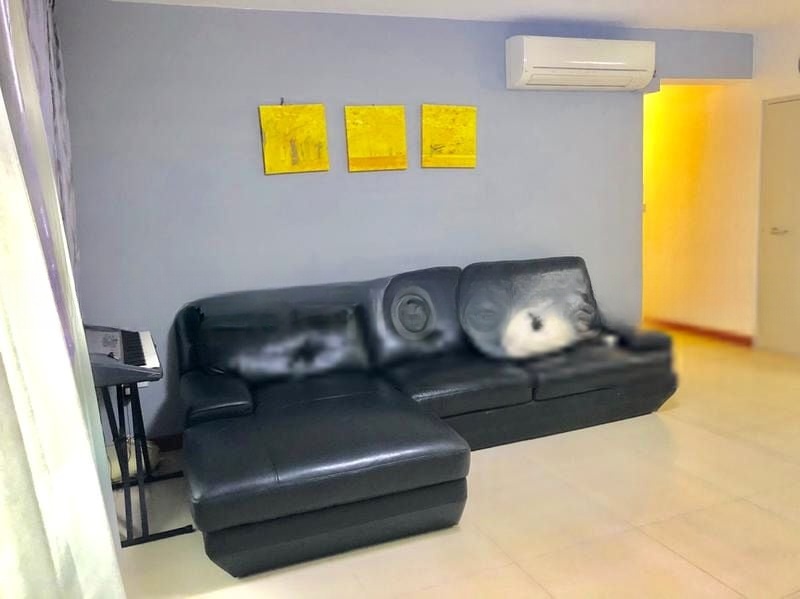 This well-maintained 3-bedroom flat features an inviting living room with a stylish L-shaped leather sofa and a ceiling fan, perfect for unwinding after a long day. The kitchen boasts sleek white cabinetry paired with striking black countertops, and a sliding glass door leads to a dedicated service yard, enhancing functionality. Each bedroom is thoughtfully designed with built-in sliding wardrobes, ensuring ample storage while maintaining a clean aesthetic.