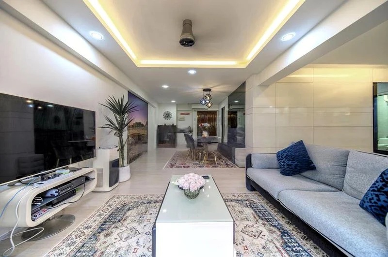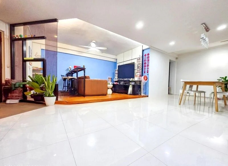 Step into this beautifully renovated executive apartment and be greeted by a harmonious blend of modern minimalist design and urban views. The spacious living and dining area features large format white floor tiles and recessed downlights, creating an inviting ambiance. A striking raised wooden platform with a blue accent wall and a glass-walled study partition adds a unique touch, allowing natural light to flow through the space.