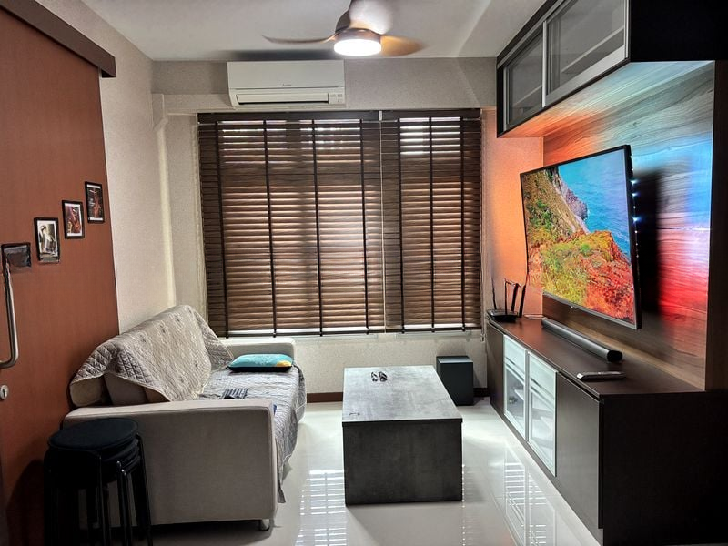 Step into a warm and inviting atmosphere where modern design meets functionality. The entrance hallway greets you with stone-textured wallpaper and a decorative pendant light that casts a beautiful radial shadow, setting the tone for the entire unit. The living room features a custom TV console with LED backlighting, complemented by wooden venetian blinds that allow for a gentle flow of natural light, creating a cozy retreat.