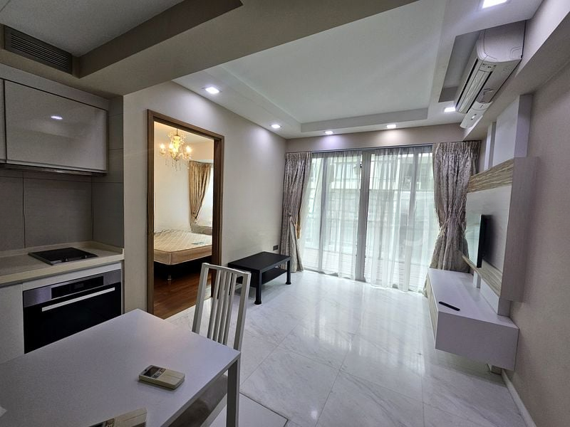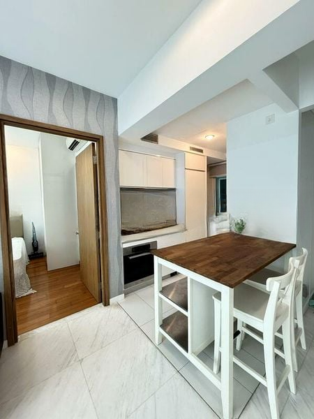 Step into a serene oasis at SUITES AT ORCHARD, where modern minimalist design meets comfort. The moment you enter, you are greeted by a well-maintained space bathed in natural light, accentuated by a stunning view of lush greenery from the balcony. The inviting ambiance is enhanced by the unique hanging egg chair and wooden decking, creating a perfect spot to unwind.