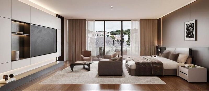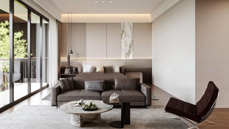 Step into a world of modern elegance as you enter this brand-new designer home, where abundant natural light floods through floor-to-ceiling glass doors, illuminating the spacious living area adorned with exquisite grey marble flooring. The ambiance is enhanced by a stunning designer chandelier, creating a warm and inviting atmosphere that seamlessly connects indoor and outdoor spaces, offering picturesque views of the lap pool and lush greenery.