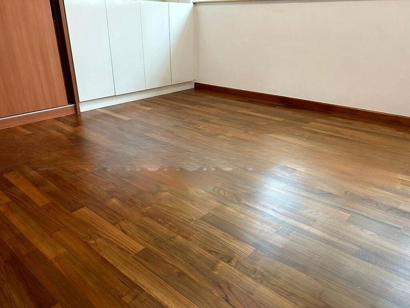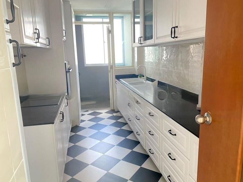 This well-designed 3-bedroom condo features standout elements such as herringbone-style parquet flooring in the bedrooms, built-in floor-to-ceiling wardrobes, and a luxurious bathroom equipped with black galaxy granite finishes and a full-sized bathtub. The kitchen boasts minimalist white cabinetry and integrated appliances, seamlessly connecting to a utility yard that offers additional space for your needs.