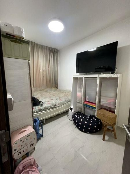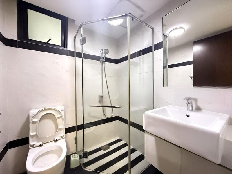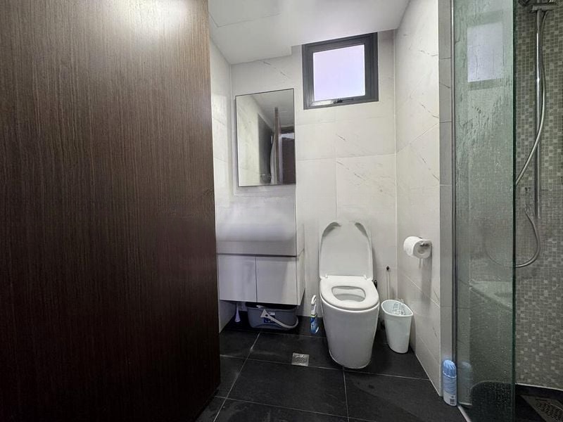 This well-maintained unit features an open-concept layout, seamlessly connecting the living and dining areas. The marble-top dining table and stylish mirror feature wall enhance the modern aesthetic, while the kitchen boasts a glass partition that allows for interaction without sacrificing space. The master bedroom is a tranquil retreat, complete with a built-in wardrobe and a large window that invites in the morning sun. The bathrooms are designed for relaxation, featuring a walk-in shower with a rain shower head and a wall-mounted vanity mirror.