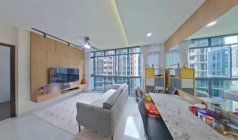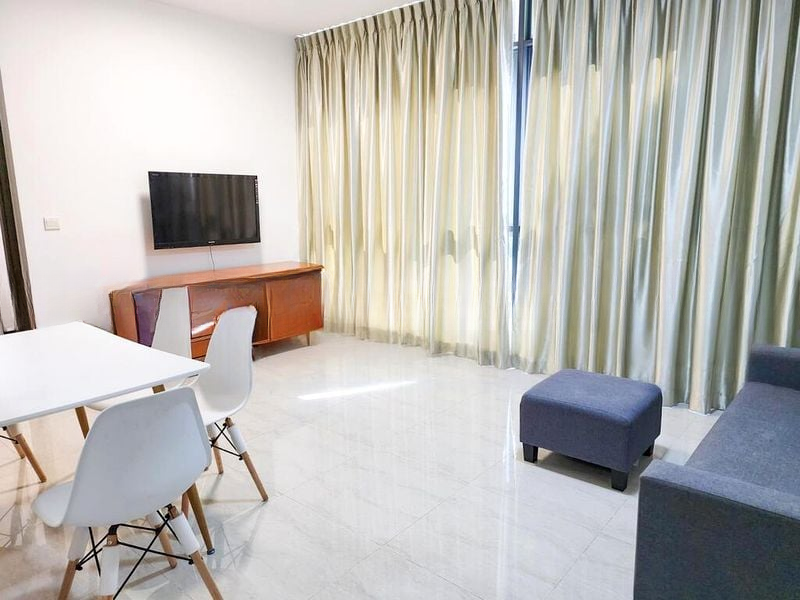 Step into a beautifully renovated sanctuary at Symphony Suites, where abundant natural light floods through floor-to-ceiling windows, illuminating the elegant wood-paneled TV feature wall and airy living space. The ambiance is both bright and inviting, offering a serene escape from the bustling city.