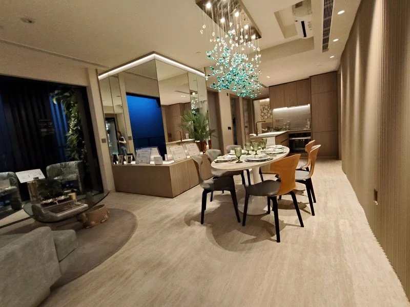Step into a realm of modern luxury at ARINA EAST RESIDENCES, where a designer crystal chandelier greets you in the open-concept dining area, casting a warm glow over the marble-top table. The living room, adorned with mirrored feature walls and textured panels, creates an inviting ambiance, while the city view at dusk offers a breathtaking backdrop that transforms your evenings into a visual delight.