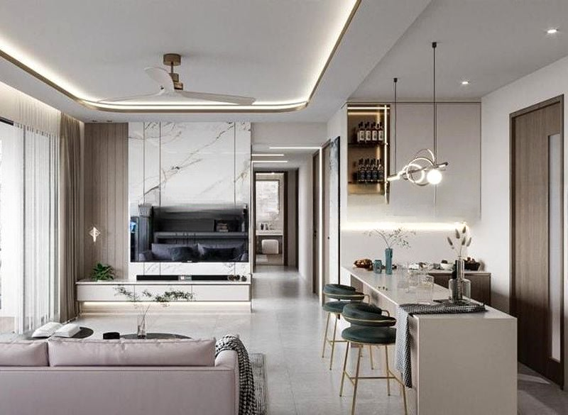 This well-maintained 2-bedroom unit features an open-concept living and dining area, adorned with a striking gold-toned chandelier and polished floor tiles. The master bedroom boasts a feature wall with a vertical light strip, while the kitchen is equipped with integrated appliances and sleek wooden cabinetry. Enjoy the convenience of two modern bathrooms, each designed with stylish grey stone-look tiles and ample storage.