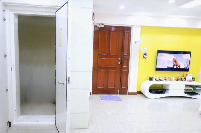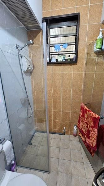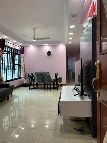 Step into this well-maintained 5-room HDB flat and feel the inviting ambiance of a functional, lived-in space. The spacious living area, adorned with white tiled flooring and a ceiling fan, is illuminated by natural light filtering through large windows, creating a warm and welcoming atmosphere.
