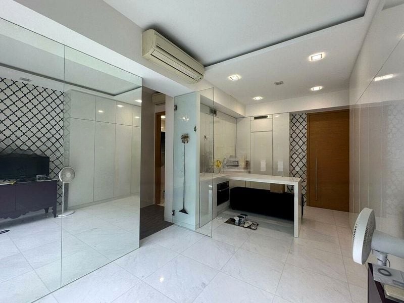 Step into a sanctuary of light and space with this beautifully renovated 1-bedroom unit at RV Residences. The moment you enter, you are greeted by an abundance of natural light streaming through the floor-to-ceiling windows, illuminating the open-concept living area adorned with mirrored walls and sleek white tiled flooring. The airy ambiance invites you to relax and unwind, while the lush greenery view adds a touch of tranquility to your urban lifestyle.