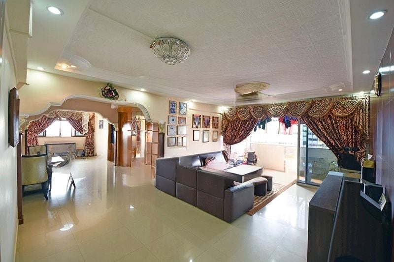 Step into this inviting 3-bedroom HDB flat, where warm parquet flooring and ornate ceiling details greet you with a sense of home. The spacious living area, adorned with a chandelier and archway partition, flows seamlessly to a balcony that offers urban views of the neighboring blocks, filling the space with moderate natural light.
